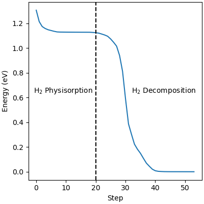 The atomistic reaction is supplemented with the reaction thermodynamics. The minimization energy trace in Figure 2 confirms the presence of two different regimes. The first regime physisorbs hydrogen to the surface and, due to the barrierless nature of hydrogen decomposition, progresses immediately into the second hydrogen decomposition pathway. The minimization continues on a nearly flat plateau until it finds the H2 decomposition pathway with each proton settling in adjacent hollow sites. The reaction thermodynamics are exothermic, releasing just over an eV of energy. This is in good agreement with experimental values, confirming that the interatomic potentials are appropriate for simulating catalytic chemistry.