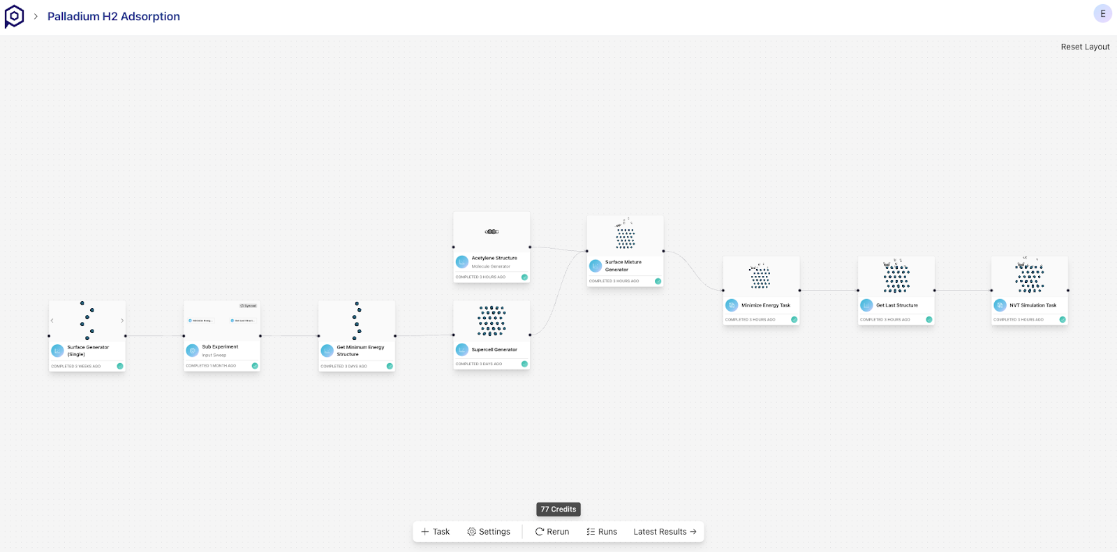 The first simulation workflow focuses on the barrierless decomposition of hydrogen on palladium to confirm the accuracy of the interatomic potential. After confirming the accuracy of the model, the second simulation workflow combines minimization and NVT simulations to predict the hydrogenation of acetylene on palladium through the Horiuti–Polanyi.