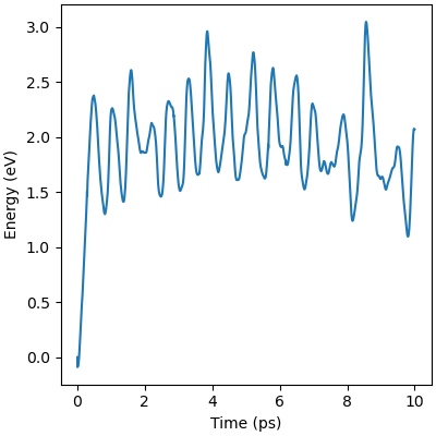 The thermodynamics are dominated by vibrations in the palladium catalyst masking much of the chemistry. The underlying trend peaks around 5ps and then decreases. This corresponds to the equilibration of the thermal energy released by the second hydrogen decomposing and the protons settling into the hollow sites. After 5ps the hydrogens in the hollow sites begin diffusing into lower energy positions reducing the energy of the system. The hydrogen surface diffusion marks the preliminary step of the Horiuti-Polanyi to move hydrogen atoms to the adsorbed acetylene molecule.