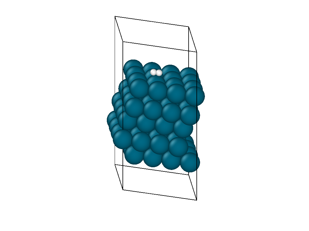 The barrierless decomposition of hydrogen on palladium is validated by adsorbing a single hydrogen molecule on a palladium surface. The hydrogen molecule is placed in the “on-top” position and allowed to relax using a conjugate gradient relaxation algorithm.