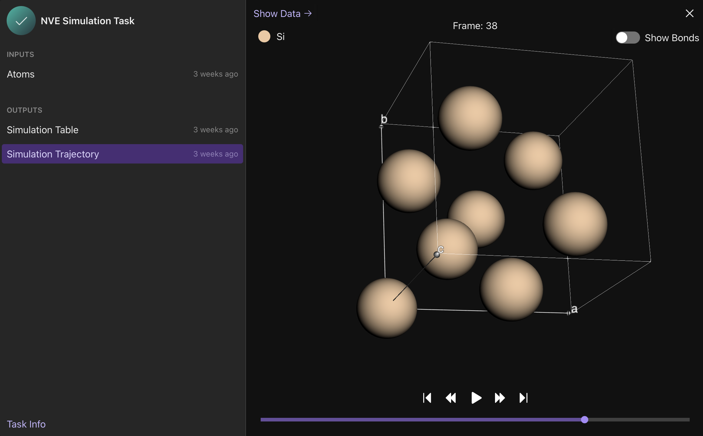 Experimental results are yours to own. Replay simulated trajectories, browse materials properties tables, analyze charts, or download data for external analysis. Automatically reuse results across experiments to efficiently compare multiple runs. Then tweak inputs or parameters, and start again.
